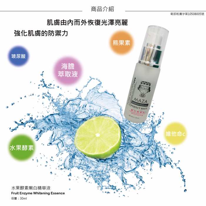 特性:水果酵素萃取液,能淨白肌膚、保濕、防止老化,使肌膚光滑有彈性。主要成分:水果酵素、氨基酸、玻尿酸、海膽萃取液、維他命C、甘油、熊果素。使用方法:潔膚後取1-2滴於臉部,稍加輕拍或按摩至吸收為止。